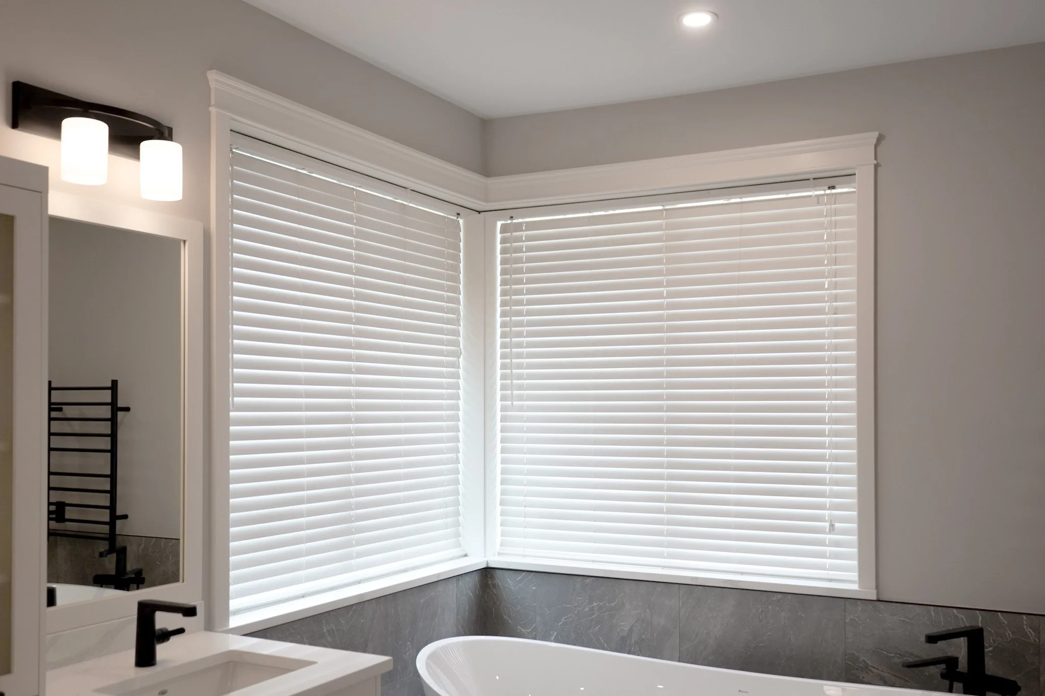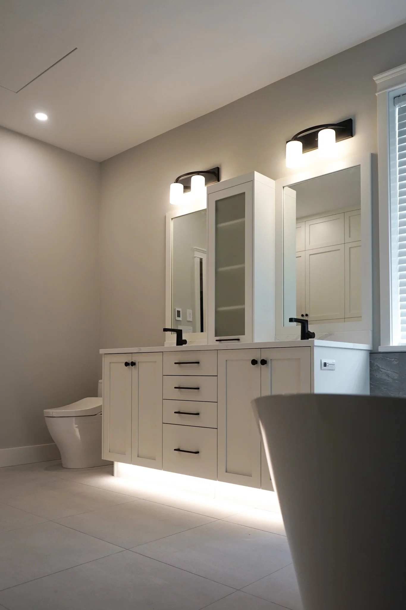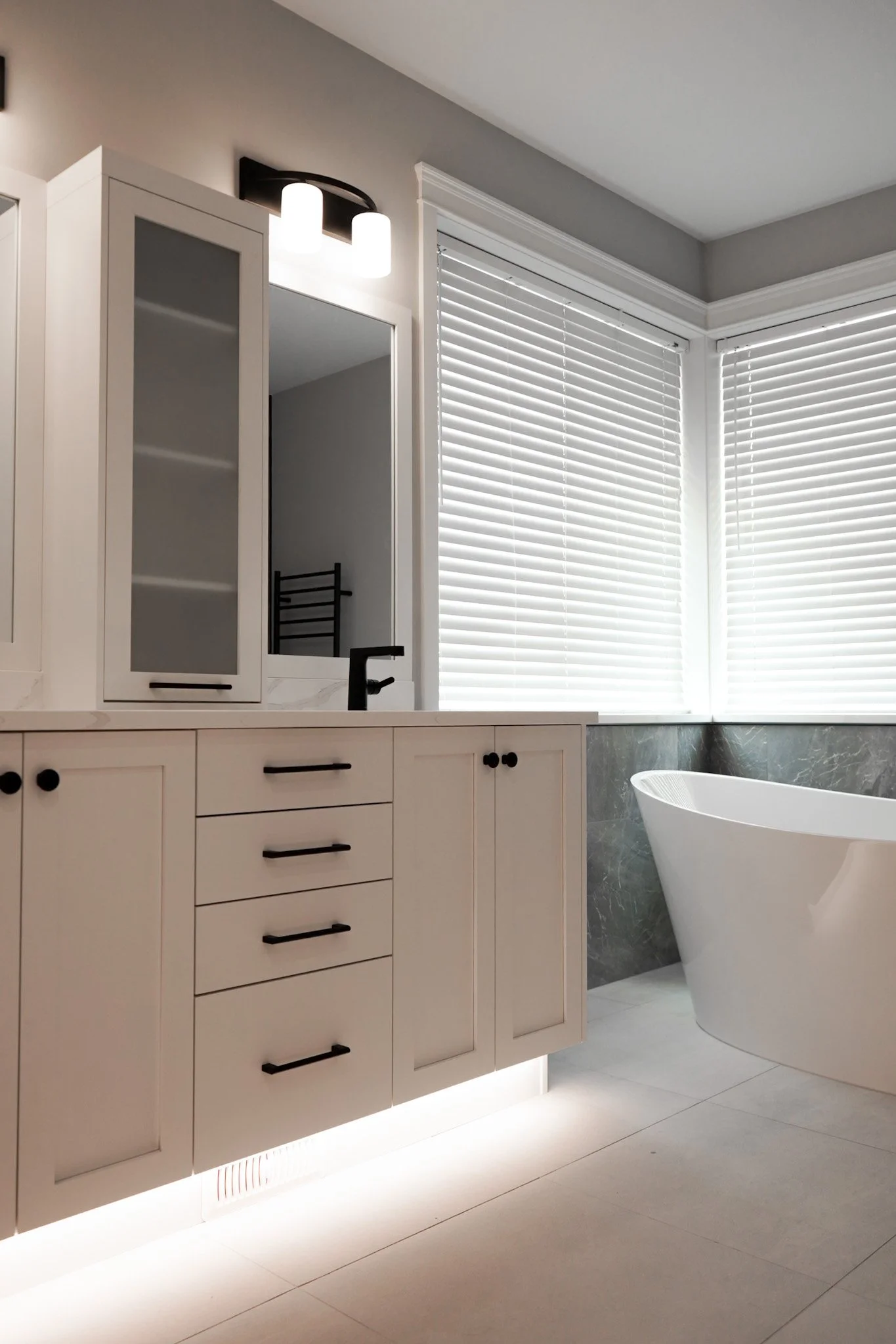The owners were so thrilled with the transformation, they had our team come back to redesign and construct their dream primary ensuite. Hoping for some much needed closet space, we were able to eliminate a rarely used home office off the foyer, enclosing this into a brand new WIC, seamless with their expansive new ensuite. With the installation of heated tile floors, a custom tiled shower, a freestanding tub with view to the garden, and toekick lighting in the vanity and closet cabinetry, the space while open and airy, was now simultaneously intimate and luxurious. Moreover, to ensure accessibility for decades to come, the uniquely redesigned ensuite & WIC hosts a curbless shower, and barrier free movement between each strategically positioned zone, maintaining areas of privacy despite the open concept layout.